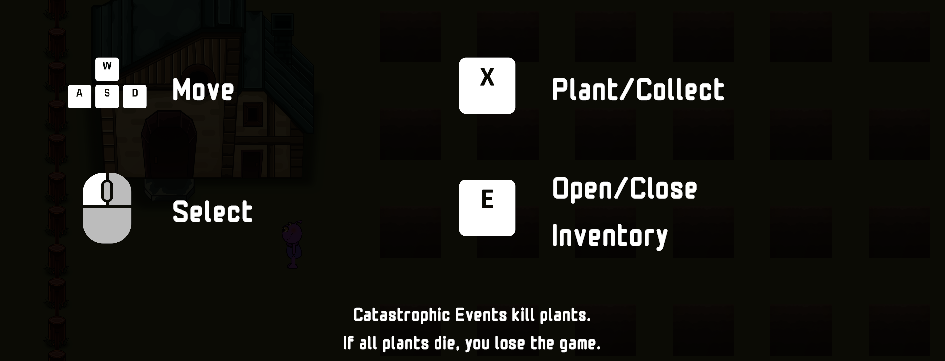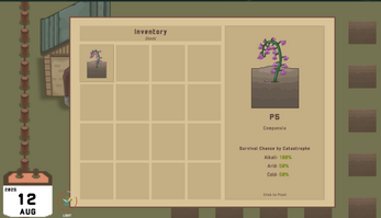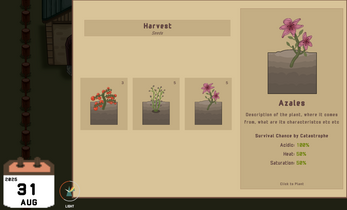 Inspired by farming sims, time-based puzzles, and economy management, the goal of the game is to plant seeds and keep them alive as long as possible, while various weather loops will target various plant characteristics, which should guide your choice of seeds you plant in the future. Weather conditions, plant seed types, and music are procedurally generated.